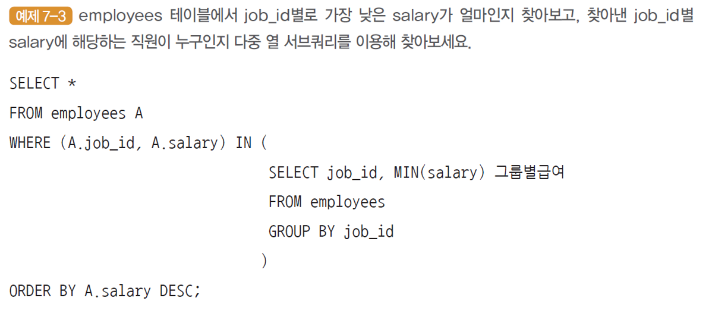 7장서브쿼리 - 단일행, 다중행등 용어는 정리 x