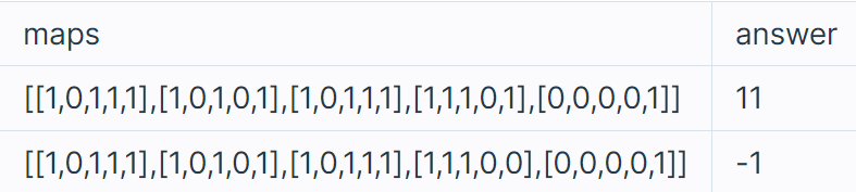 제한사항- maps는 n x m 크기의 게임 맵의 상태가 들어있는 2차원 배열로, n과 m은 각각 1 이상 100 이하의 자연수입니다.