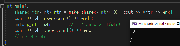 shared_ptr<int> ptr = make_shared<int>(10); cout << *ptr << endl;