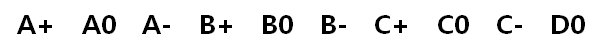 string grades[] = { "A+", "A0", "A-", "B+", "B0", "B-", "C+", "C0", "C-", "D0" };